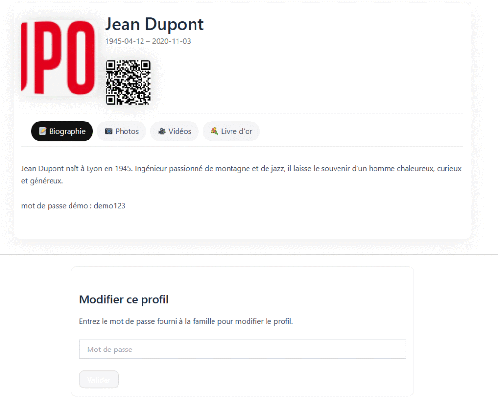 Offrez une page hommage élégante, protégée par mot de passe, avec photos, vidéos et livre d’or. Un QR Code vous permet d’y accéder depuis la plaque, la cérémonie ou le souvenir imprimé.